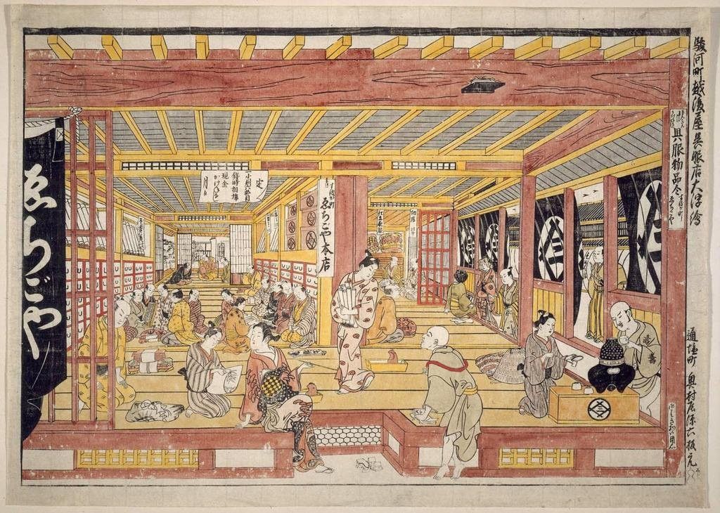 Echigoya store: A leading kimono store in Edo which sold kimono fabrics. Started cash sales and prospered.