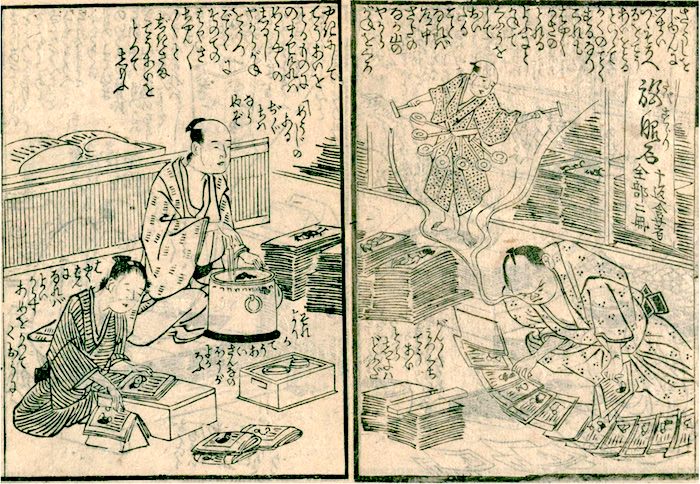 Book wholesaler: Merchants who ran rental bookstores visited book wholesalers to purchase books to lend to townspeople and peasants. The rental books included historical dramas, picture books, Buddhist books, tourist guidebooks, novels, Confucian books, and practice books. At the end of the Edo period, there were about 800 rental bookstores in Edo.